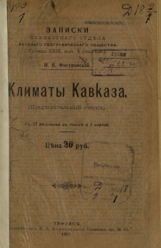 Записки Кавказского отдела РГО. Кн. XXIX, Вып. 5 : Климаты Кавказа (Предварительный очерк) / И.В. Фигуровский - Тифлис, 1919