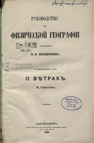 Филиппов, Николай Николаевич. Руководство к физической географии / сост. Н.Н. Филиповым. С прил. стат. "О ветрах" М. Рыкачева. - Санкт-Петербург : Тип. Акад. наук, 1869