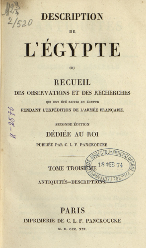 Description de l'Égypte ou Recueil des observations et des recherches qui ont été faites en Égypte pendant l'expédition de l'Armée française. T. 3 : Antiquités - Descriptions / Publiée par C.L.F. Panckoucke. - 2e éd.- Paris : Imprimerie de C.L.F. Panckoucke, 1821