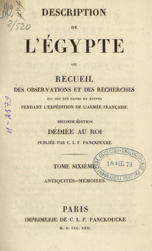 Description de l'Égypte ou Recueil des observations et des recherches qui ont été faites en Égypte pendant l'expédition de l'Armée française. T. 6 : Antiquités - Mémoirs / Publiée par C.L.F. Panckoucke. - 2e éd.- Paris : Imprimerie de C.L.F. Panckoucke, 1822