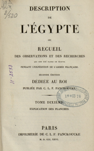 Description de l'Égypte ou Recueil des observations et des recherches qui ont été faites en Égypte pendant l'expédition de l'Armée française. T. 10 : Explication des planches / Publiée par C.L.F. Panckoucke. - 2e éd.- Paris : Imprimerie de C.L.F. Panckoucke, 1826