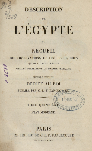 Description de l'Égypte ou Recueil des observations et des recherches qui ont été faites en Égypte pendant l'expédition de l'Armée française. T. 15 : État moderne / Publiée par C.L.F. Panckoucke. - 2e éd.- Paris : Imprimerie de C.L.F. Panckoucke, 1826
