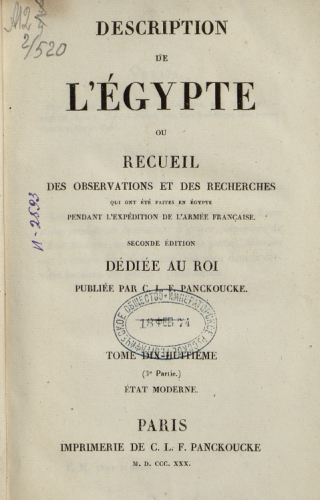 Description de l'Égypte ou Recueil des observations et des recherches qui ont été faites en Égypte pendant l'expédition de l'Armée française. T. 18, (3) : État moderne / Publiée par C.L.F. Panckoucke. - 2e éd.- Paris : Imprimerie de C.L.F. Panckoucke, 1830