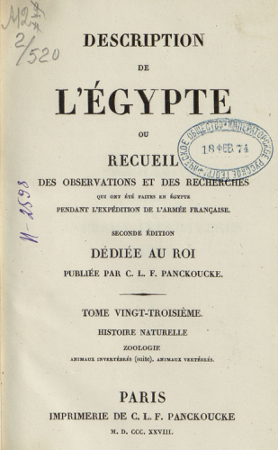 Description de l'Égypte ou Recueil des observations et des recherches qui ont été faites en Égypte pendant l'expédition de l'Armée française. T. 23 : Histoire naturelle. Zoologie / Publiée par C.L.F. Panckoucke. - 2e éd.- Paris : Imprimerie de C.L.F. Panckoucke, 1828