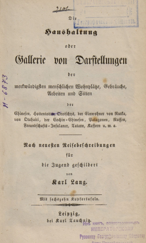Lang, Carl (1766-1822). Die Haushaltung oder Gallerie von Darstellungen : der merkwürdigsten menschlichen Wohnplätze, Gebräuche, Arbeiten und Sitten der Tagalen auf Manila, der Spanischen Colonisten in Conception, der Kukies auf Tipra, der Caraiben, Portugiesen, Tscherkessen, Perser, Waddahs, Taurischen Gebirgstatarn, Spanier, Osmanen, Neger der Goldküste a.m.a. ; nach neuesten Reisebeschreibungen für die Jugend geschildert. Bd. 2 / von Karl Lang. - Leipzig : Tauchnitz, [1810]