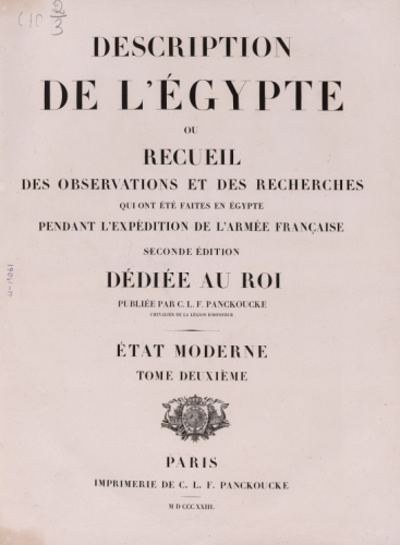 Description de l'Égypte ou Recueil des observations et des recherches qui ont été faites en Égypte pendant l'expédition de l'Armée française. [Planches]. État moderne. T. 2. / Publiée par C.L.F. Panckoucke. - 2e éd.- Paris : Imprimerie de C.L.F. Panckoucke, 1823