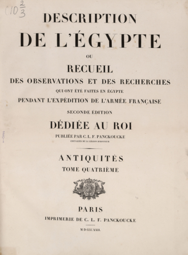 Description de l'Égypte ou Recueil des observations et des recherches qui ont été faites en Égypte pendant l'expédition de l'Armée française. [Planches]. Antiquités. T. 4. / Publiée par C.L.F. Panckoucke. - 2e éd.- Paris : Imprimerie de C.L.F. Panckoucke, 1822