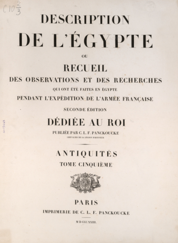 Description de l'Égypte ou Recueil des observations et des recherches qui ont été faites en Égypte pendant l'expédition de l'Armée française. [Planches]. Antiquités. T. 5. / Publiée par C.L.F. Panckoucke. - 2e éd.- Paris : Imprimerie de C.L.F. Panckoucke, 1823