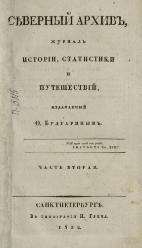 Северный архив : Журнал истории, статистики и путешествий. Ч. 2. / изд. Ф. Булгариным. - Санкт-Петербург : Тип. Н. Греча, 1822