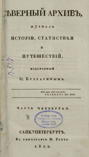 Северный архив : Журнал истории, статистики и путешествий. Ч. 4. / изд. Ф. Булгариным. - Санкт-Петербург : Тип. Н. Греча, 1822