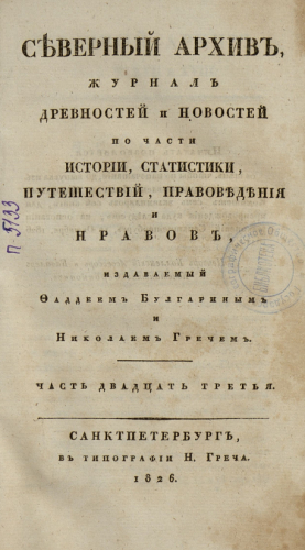 Северный архив : Журнал древностей и новостей по части истории, статистики, путешествий, правоведения и нравов. Ч. 23-24. / изд. Фаддеем Булгариным и Николаем Гречем. - Санкт-Петербург : Тип. Н. Греча, 1826