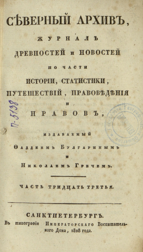 Северный архив : Журнал древностей и новостей по части истории, статистики, путешествий, правоведения и нравов. Ч. 33-34. / изд. Фаддеем Булгариным и Николаем Гречем. - Санкт-Петербург : Тип. Имп. Воспитательного дома, 1828