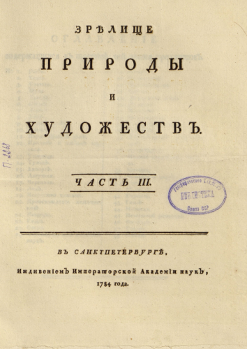 Зрелище природы и художеств. Ч. III. / ижд. Имп. Акад. наук. - Санкт-Петербург, 1784