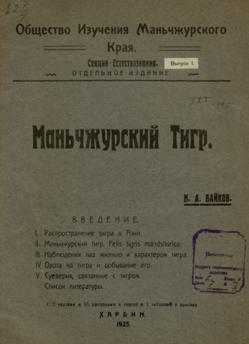 Общество изучения Маньчжурского края. Серия А, Вып. 1 : Маньчжурский тигр / Н.А. Байков ; Секция естествознания. - Харбин, 1925
