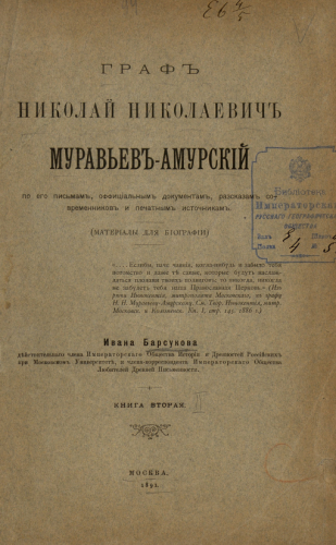 Барсуков, Иван Платонович (1841-1906). Граф Николай Николаевич Муравьев-Амурский по его письмам, официальным документам, рассказам современников и печатным источникам : (материалы для биогр.). Кн. 2 : [Записки и официальная переписка графа Н.Н. Муравьева-Амурского] / [соч.] Ивана Барсукова, д. чл. Имп. О-ва истории и древностей рос. при Моск. ун-те и чл.-кор. Имп. О-ва любителей древ. письменности. - Москва : Синод. тип., 1891
