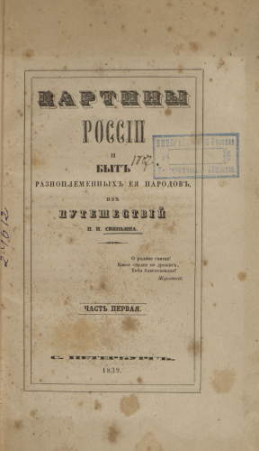 Свиньин, Павел Петрович (1787-1839). Картины России и быт разноплеменных ее народов. Ч. 1. / из путешествий П.П. Свиньина. - Санкт-Петербург : Тип. Н. Греча, 1839