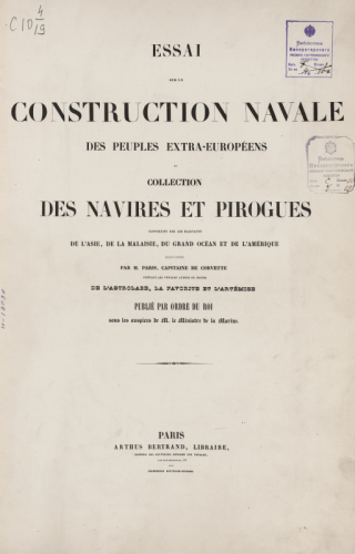 Pâris, François-Edmond (1806-1893). Essai sur la construction navale des peuples extra-européens ou Collection des navires et pirogues construits par les habitants de l'Asie, de la Malaisie, du Grand Océan et de l'Amérique / par m. Paris. - Paris: Arthus Bertrand, [1841]