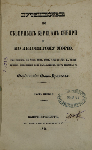 Врангель, Фердинанд Петрович (1796/1797-1870). Путешествие по северным берегам Сибири и по Ледовитому морю, совершенное в 1820, 1821, 1822, 1823 и 1824 г. экспедицией, состоявшей под начальством флота лейтенанта Фердинанда фон-Врангеля. Ч. 1. - Санкт-Петербург : Тип. А. Бородина и К°, 1841