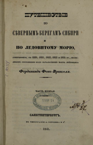 Врангель, Фердинанд Петрович (1796/1797-1870). Путешествие по северным берегам Сибири и по Ледовитому морю, совершенное в 1820, 1821, 1822, 1823 и 1824 г. экспедицией, состоявшей под начальством флота лейтенанта Фердинанда фон-Врангеля. Ч. 2. - Санкт-Петербург : Тип. А. Бородина и К°, 1841