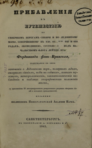 Врангель, Фердинанд Петрович (1796/1797-1870). Прибавления к Путешествию по северным берегам Сибири и по Ледовитому морю, совершенное в 1820, 1821, 1822, 1823 и 1824 г. экспедицией, состоявшей под начальством флота лейтенанта Фердинанда фон-Врангеля, содержащие в себе: замечания о Ледовитом море, полярных льдах, северных сияниях, езде на собаках, языках туземцев, метеорологические, климатологические наблюдения и таблицы географического положения мест / изд. иждивением Имп. Акад. наук. - Санкт-Петербург : Тип. А. Бородина и К°, 1841