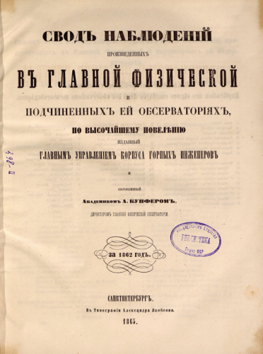 Свод наблюдений, произведенных в Главной физической и подчиненных ей обсерваториях за 1862 год / по высочайшему повелению изд. Гл. упр. Корпуса горных инженеров и сост. акад. А. Купфером, директором Главной физической обсерватории. - Санкт-Петербург : Тип. Александра Якобсона, 1865