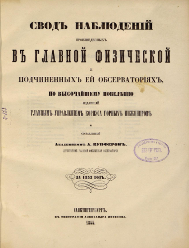 Свод наблюдений, произведенных в Главной физической и подчиненных ей обсерваториях за 1853 год / по высочайшему повелению изд. Гл. упр. Корпуса горных инженеров и сост. акад. А. Купфером, директором Главной физической обсерватории. - Санкт-Петербург : Тип. Александра Якобсона, 1855