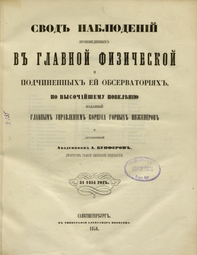 Свод наблюдений, произведенных в Главной физической и подчиненных ей обсерваториях за 1854 год / по высочайшему повелению изд. Гл. упр. Корпуса горных инженеров и сост. акад. А. Купфером, директором Главной физической обсерватории. - Санкт-Петербург : Тип. Александра Якобсона, 1856