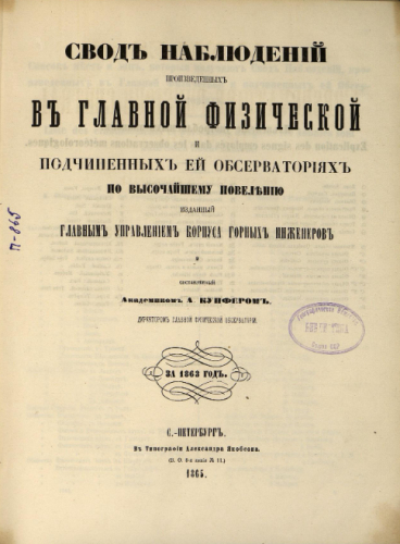 Свод наблюдений, произведенных в Главной физической и подчиненных ей обсерваториях за 1863 год / по высочайшему повелению изд. Гл. упр. Корпуса горных инженеров и сост. акад. А. Купфером, директором Главной физической обсерватории - Санкт-Петербург : Тип. Александра Якобсона, 1865