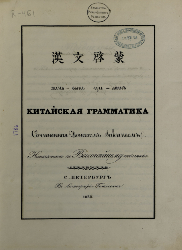 Иакинф (Бичурин, Никита Яковлевич; 1777-1853). Хань-вынь ци-мын : китайская грамматика / Соч. монахом Иакинфом. - Санкт-Петербург : Литогр. Гемильяна, 1838