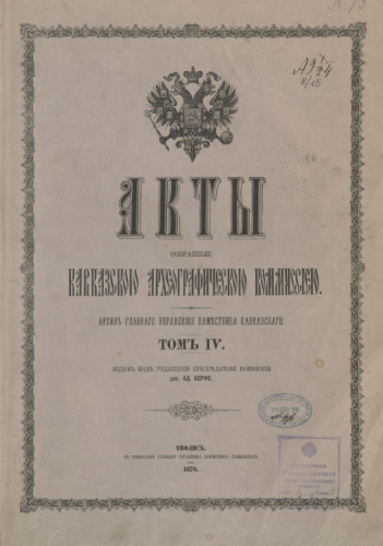 Акты, собранные Кавказской Археографической комиссией.Т. 4 : [Кавказ и Закавказье за время управления генерала от кавалерии Александра Петровича Тормасова, 1809-1811] / напеч. под ред. председателя Комиссии с. с. Ад. Берже. - 1870. - [4], 1015 с., 5 л. портр.