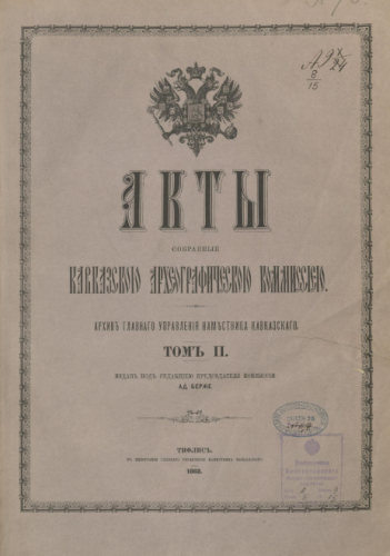 Акты, собранные Кавказской Археографической комиссией. Т. 2 : [Кавказ и Закавказье за время управления генерала от инфантерии князя Павла Дмитриевича Цицианова, 1802-1806] / напеч. под ред. председателя Комиссии с. с. Ад. Берже. - 1868. - VI, 1238 с., 3 л. портр.