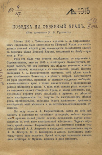 Гурский, И. В. Поездка на Северный Урал : (Из дневника И.В. Гурского). - [Тобольск] : Тип. Тобольского губ. правления, 1893